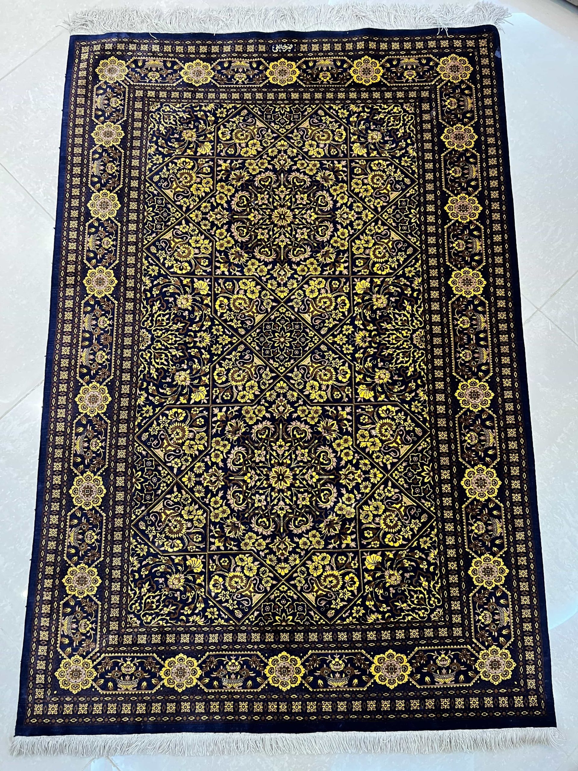 فرش ابریشم دستبافت قم کد 00104 | ابعاد 1×1.5 متر (ذرع و نیم) | قم | طرح سه رنگ
