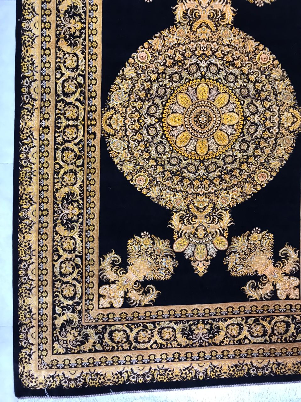 مناسب افرادی که به دنبال فرش ابریشم دستبافت نفیس ایرانی برای تزئین سالن، میز یا بهعنوان تابلو هستند. ترکیب رنگ مشکی و طلایی، حس لوکس و کلاسیک را در فضا ایجاد میکند.